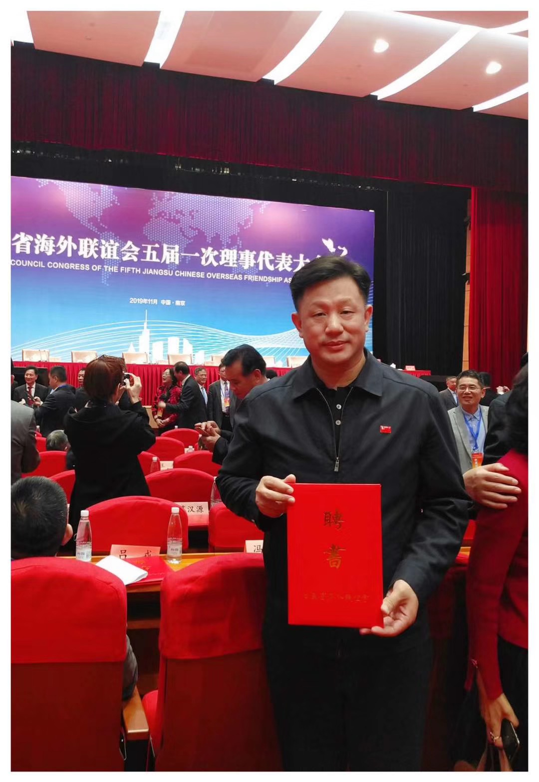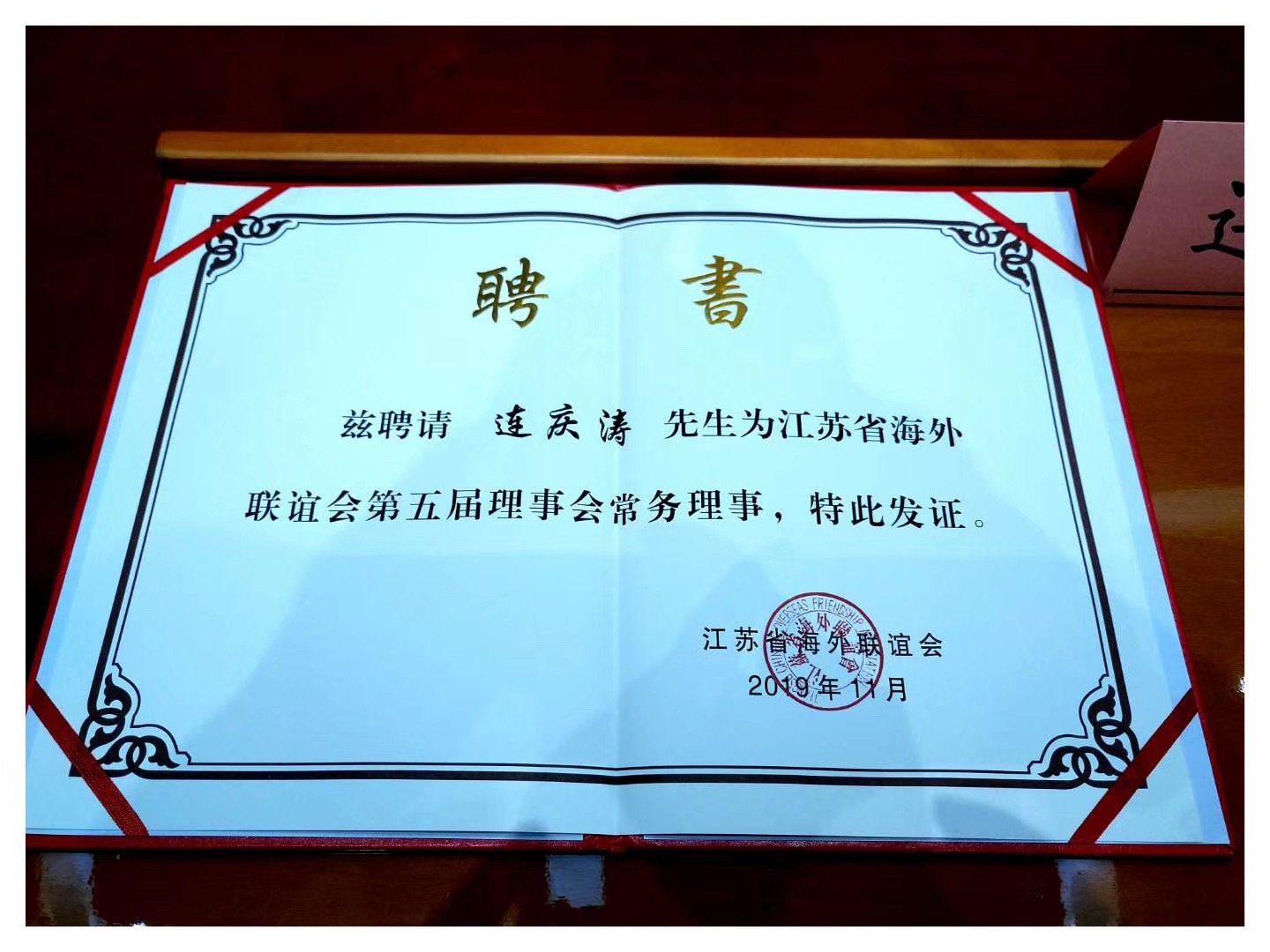 2019年11月17日,热烈祝贺连庆涛会长担任江苏省海外联谊会第五届理事会常务理事。