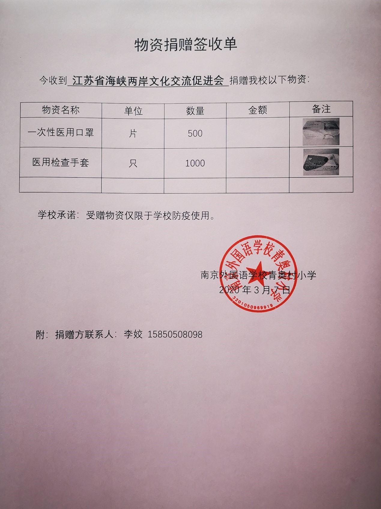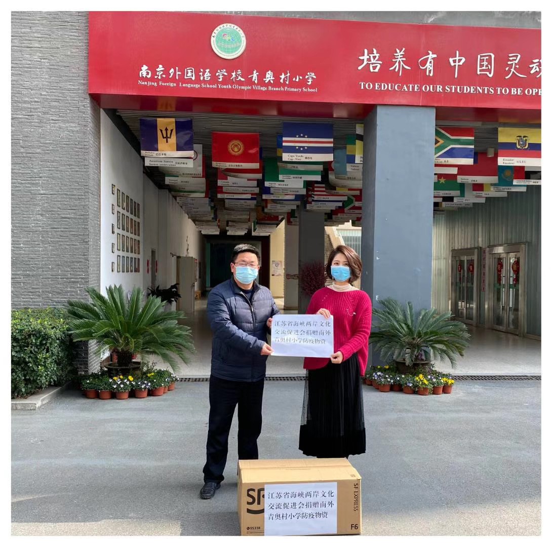 日,江苏省海峡两岸文化交流促进会向南外青奥村小学捐赠一批口罩和防护手套,向在疫情期间奋战在岗位上的教师表达一份敬意。