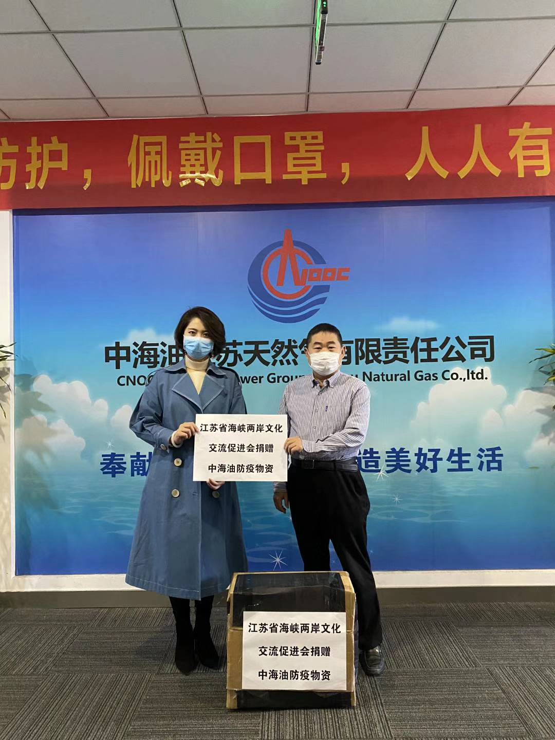 年3月20日上午,海促会一行来到中海油江苏公司捐赠1000只口罩,向中海油复工人员送去诚挚的问候。