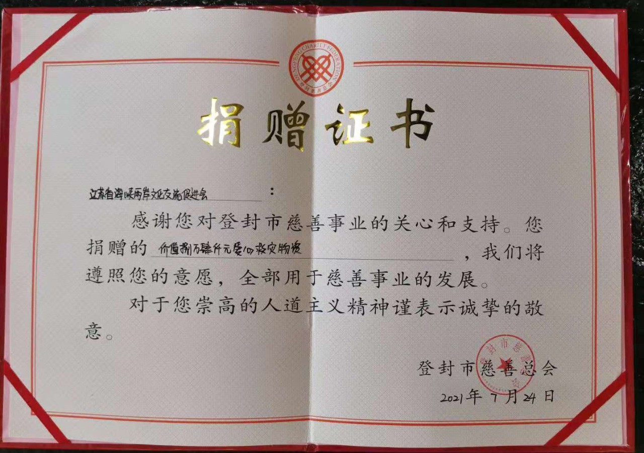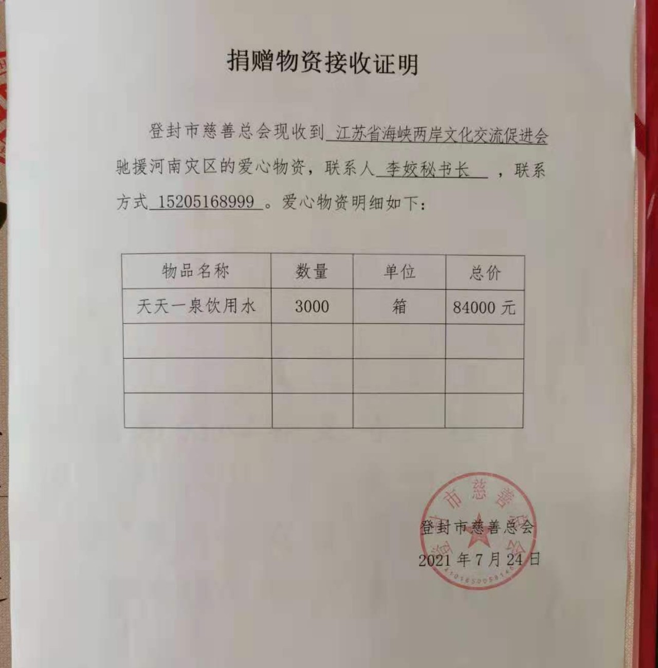 7月22日,江苏省海峡两岸文化交流促进会得知郑州洪涝灾害人们生活缺食用水的消息,连庆涛会长立刻组织会员单位共同筹集物资,短时间内购买了三千箱纯净水捐赠给灾区,由郑州登封市慈善总会接收。海促会全体同仁祝愿郑州灾民在党和政府领导下同舟共济,共抗天灾,早日重建家园!郑州加油!